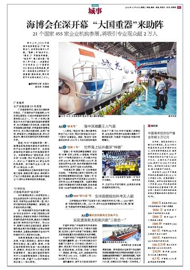 昨日上午,2019中国海洋经济博览会(下称“海博会”)在深圳会展中心开幕。“蓝鲸1号”钻井平台、“雪龙2”号极地考察船、“蛟龙号”载人潜水器、“海洋二号”卫星……本届展会不仅有来自21个国家的455家企业与机构参展,更有一批我国自主研制的“大国重器”集体亮相,预计将吸引专业观众超过2万人。