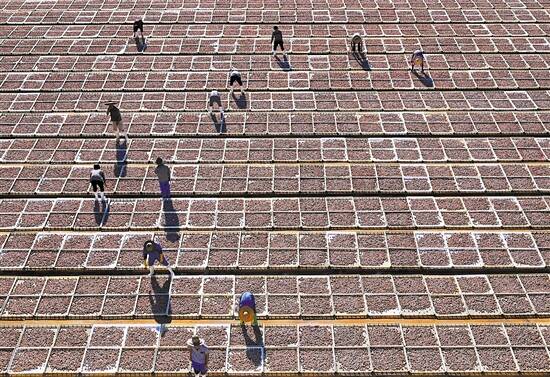 ■在广东梅业公司的工厂里,阳光的炙烤下,一颗颗小巧的青梅与盐分融合,即将进化为令人垂涎的话梅。一筐筐青梅成排地晾晒着,大片绯红色装点着大地。