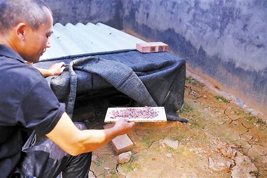 ■平台镇妙门村养蛇小区,朱兆鹏将蛇的餐食摆入仓内。