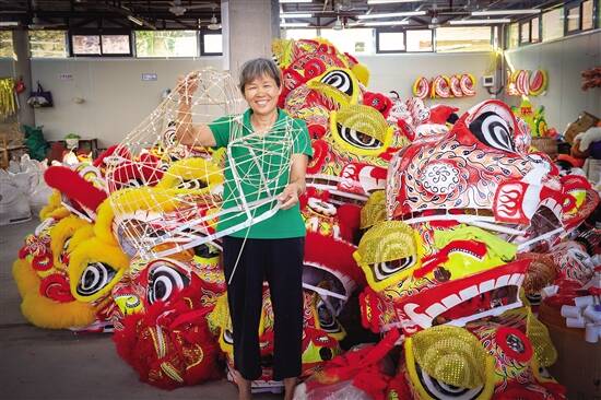 身为醒狮扎作传承人的陈金明说,经过多年研究和改良工艺制作流程,他改成了拆分式流水工艺制作模式,把原本复杂的制作工艺变得简单易学易推广。去年,醒狮文化公司在楼镇村成立,全村包括61户贫困户在内的671户家庭都入股了该公司。
