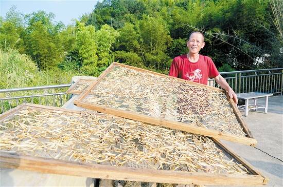 ■明德村贫困户张锦芳在院中晾晒金针菜。