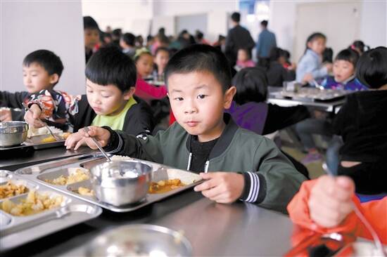 ■柏杨林恒大阳光小学,孩子们正在吃政府免费发放的午餐。