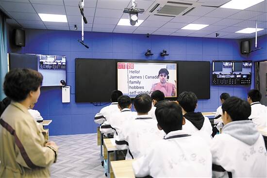 ■赫章县第三中学远程教育智慧平台中心,学生们的外语课可以与外教互动交流。