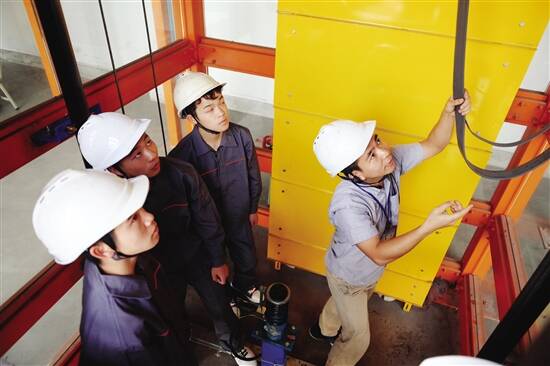 ■来自黔南州的贫困生们在实训课上学习、实践如何修理电梯。
