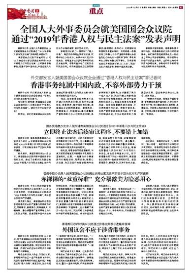 杨光表示,美国东部时间10月15日,美国国会众议院不顾中国政府多次强烈反对,通过了由部分议员提出的《2019年香港人权与民主法案》,这种行为粗暴干涉中国内政,公然为香港反对派和激进势力张目打气,充分暴露出美国国会众议院和一些政客借打香港牌牵制和遏制中国发展的政治图谋。