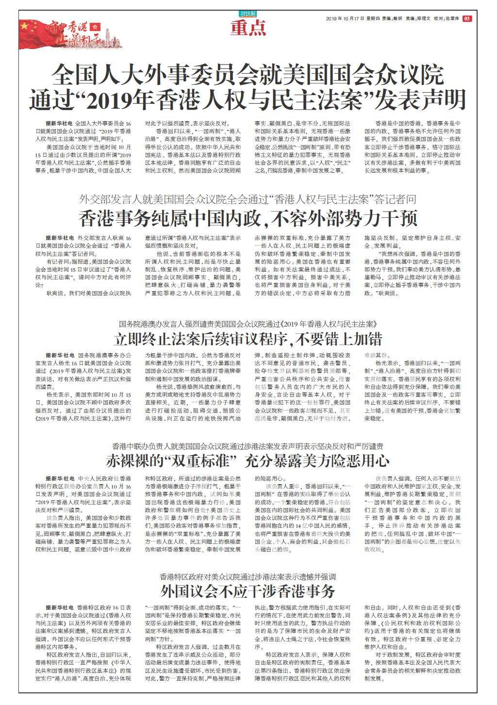 全国人大外事委员会就美国国会众议院 通过“2019年香港人权与民主法案”发表声明