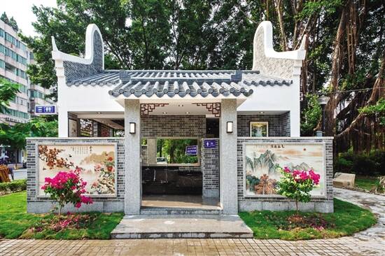 近日,记者来到石井街文化广场,看到这里的公厕改造成了岭南风格建筑,外观典雅,周围花草环绕,整体风格与公园环境和谐融为一体。