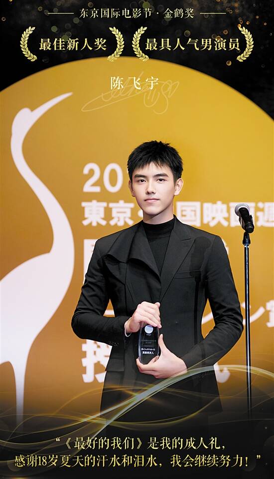 新快报讯 记者梁晓雯报道 2019东京国际电影节中国电影周“金鹤奖”颁奖礼日前举行,电影《最好的我们》一举斩获三项大奖,陈飞宇也拿下金鹤奖最佳新人奖、最具人气男演员两项大奖,他表示影片对自己意义非凡“代表18岁成年礼”。东京电影节中国电影周展映活动上,《最好的我们》展映场爆满,陈飞宇也出席了映后见面会并和现场观众互动交流,当被问及如何诠释角色的阳光与悲伤两个方向,他坦言自己没想太多,用最真挚的表演方式呈现出来就好。自电影《最好的我们》6月上映以来,许多的电影观众通过余淮这个角色认识到了不一样的陈飞宇,他也成为千禧一代的新人气偶像。颁奖礼现场,陈飞宇以一身黑色的拖尾西装亮相,这次凭借影片获得金鹤奖最佳新人、最具人气男演员两项大奖,他表示:“这部电影是我在18岁的时候拍摄的,也是我认为近几年来最有意义的一年,同时也代表着我的成年礼。我自己非常享受整个拍摄过程,也希望日本的观众朋友们可以喜欢《最好的我们》这部电影。”
