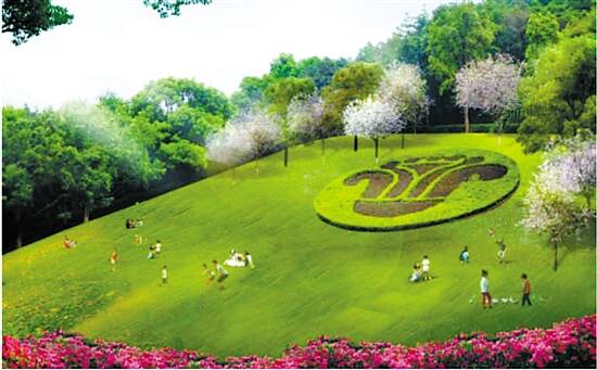 招标文件提出,本路段绿化整体乔木生长良好,通过清除杂乱中下层植物,竹林下层重铺草皮,打通湖面视线,让游客可以观赏湖面。折线景墙周边进行精致化植物景观设计。