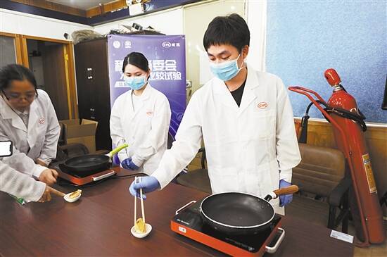 ■通报会上,技术人员在现场演示不粘性能极限体验。