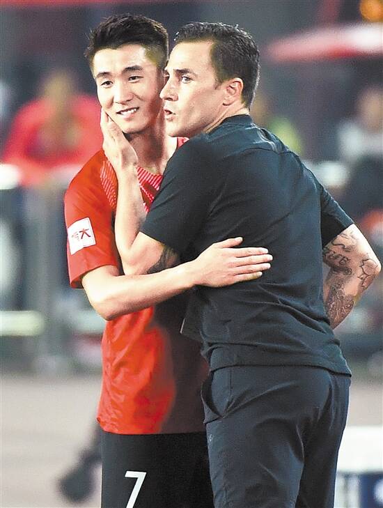 ■广州恒大主教练卡纳瓦罗(右)与韦世豪。 新华社发 卡纳瓦罗:还有两场,不能松! (设计台词)