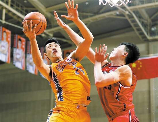 ■上海队球员鞠明欣(左)上篮。 新华社发