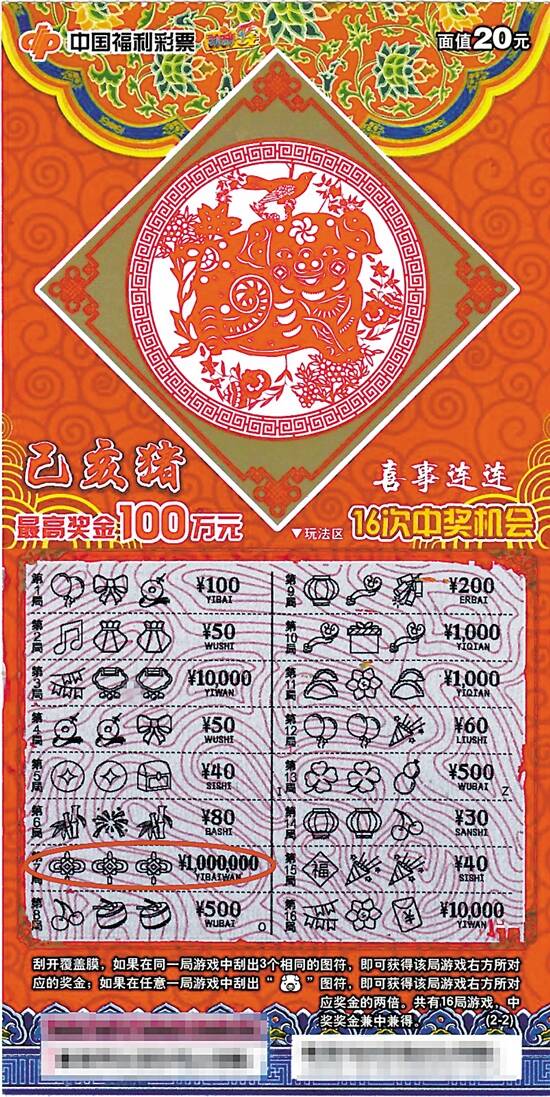 当天下午,吴先生前后付钱买的票和重复中奖后兑换的彩票金额合共大约300元,在刮开最后一张“己亥猪”时,一比对玩法区的图符,发现第7局有三个相同的中国结符号,熟知中奖规则的他知道自己中奖了,再往右奖金区仔细一看,竟是一长串的“¥1,000,000 YIBAIWAN”,点过数字后,发现自己被一等奖砸中了,吴先生非常激动和高兴,连忙请销售员帮他再一次确认自己有没有看错,销售员再三确认吴先生中得100万元,并向他道喜。