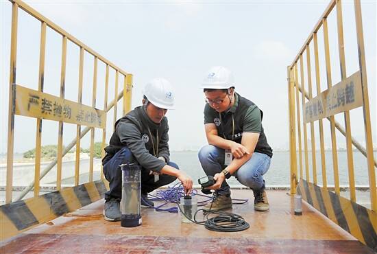 ■海门湾桥闸具有增加干流水的动能,提高水体的自净能力,图为水务工作者测试海门湾水质。