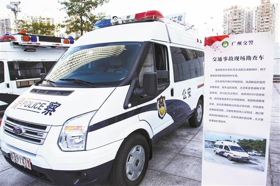 广州交警李警官介绍,面对舞台的4辆车同样是广州交警的主要高科技装备,分别是交通事故现场勘查车、移动警务车、交通违法整治4G现场拍摄传输车。