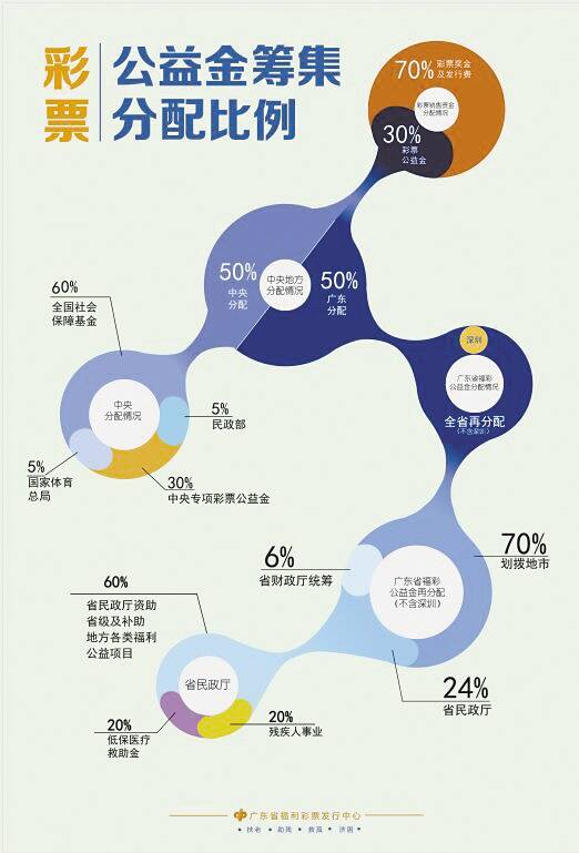 广东省留成的福利彩票公益金在除去深圳市单列的公益金外,70%拨给各市财政用于社会福利事业,6%用于省财政统筹基金,24%留成到省级民政部门使用。在省级民政部门的公益金分配中,20%专项用于全省残疾人事业,20%专项用于全省低保医疗救助基金,剩余的60%由省民政厅用于资助及补助地方的福利公益项目。
