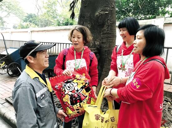▲▲海珠志愿者参加”福袋传城“行动,为清洁工人送上爱心礼物。 受访者供图