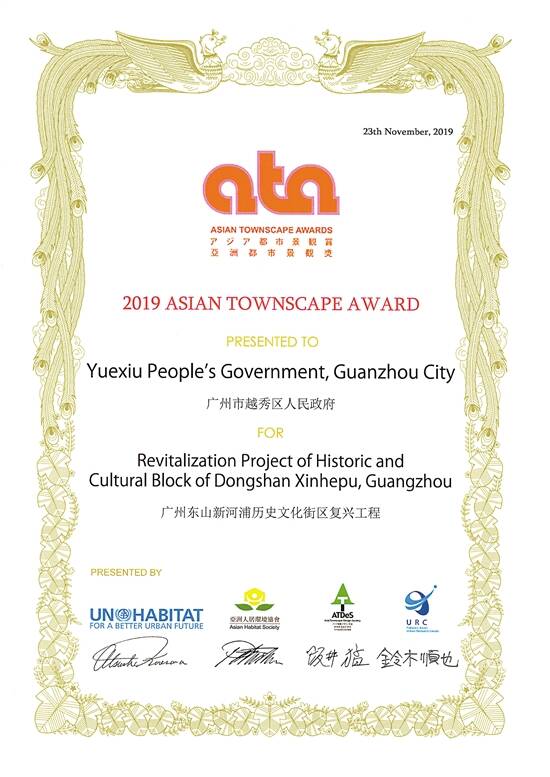 2019年11月29日, “亚洲都市景观奖”颁奖礼现场上,越秀区代表从联合国人居署亚太办事处主任是泽优先生,亚洲景观设计学会名誉会长、亚洲都市景观奖专家评审委员会主任佐藤优先生手中,接过了奖状。