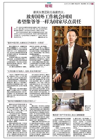 近日,按约定时间霍英东集团副总裁霍启文接受了新快报记者的专访。据悉,霍启文为此次专访做了精心准备,甚至包括穿着也颇有斟酌,谦逊斯文、追求完美这也是很多人对霍启文的印象。因为对完美的执着追求,霍启文在兼顾家族事业的同时,仍然坚持创业,在项目开发时追求高品质,“希望可以像爷爷霍英东那样白手起家,用一生的经历和能力去贡献国家,尽一点责任,带给大家更美好的生活。”