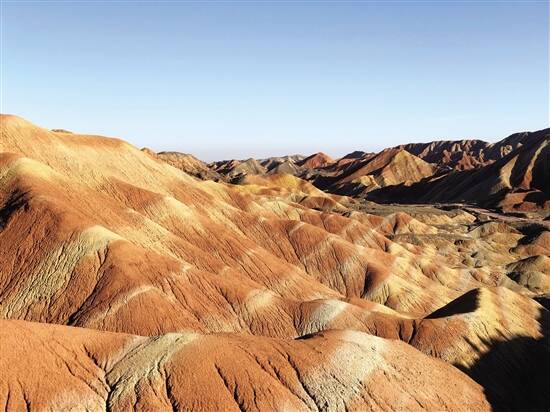 其实,早在张艺谋的《三枪拍案惊奇》里,那一望无际的红色山脉已经深深吸引众多观众。不同于南方丹霞的奇、险、峻,张掖丹霞的美更多在于靓丽的色泽。随处可见的鲜艳颜色,将沟沟壑壑装点得绚丽多彩。