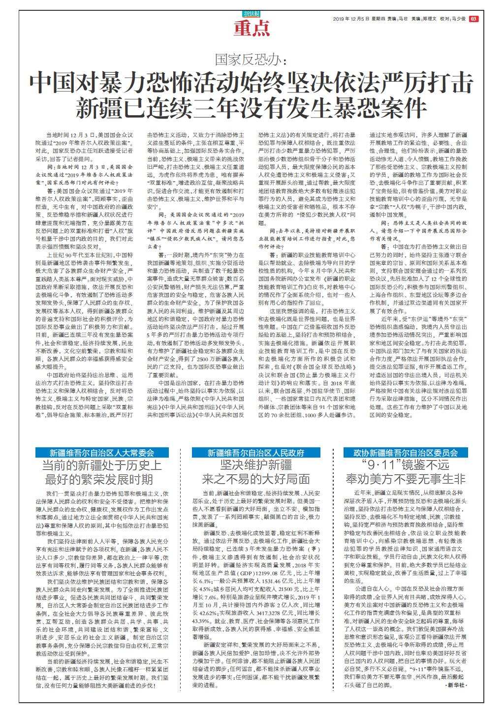 国家反恐办:中国对暴力恐怖活动始终坚决依法严厉打击 新疆已连续三年没有发生暴恐案件