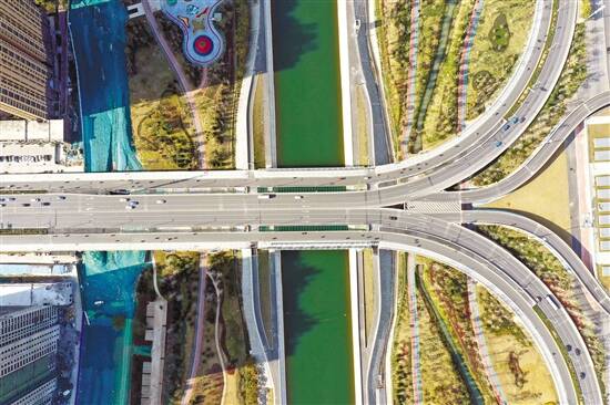 这是12月5日无人机拍摄的河南省焦作市区南水北调干渠及两岸风景。南水北调干渠河南焦作段总长76.41公里,焦作是中线工程总干渠唯一从中心城区穿越的城市。南水北调干渠焦作段,被称为“人造悬河”。与其他地方不同,南水北调中线干渠焦作城区段大部分不是挖出来的,而是垒出来的河道,是一条名副其实的地上河。 新华社发