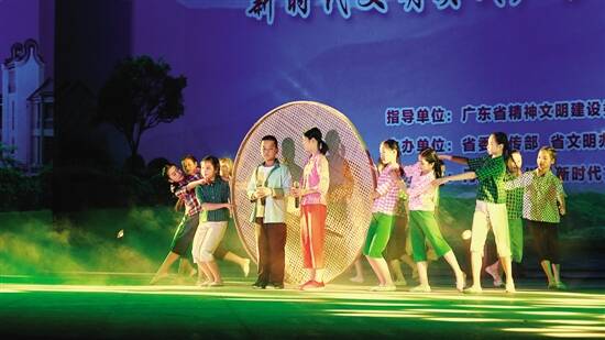 客家民俗表演《风调雨顺》拉开了当晚展演的序幕,呈现出浓郁的客家味道;原创弹唱《文明飞歌》寓意新时代文明之风吹进千家万户;来自顺德的两位演员通过男女对唱,送上了风情独特的疍家咸水歌《对花》;杂技《滑稽杂耍》爆燃全场 …… 最后,展演在《我和我的祖国》的嘹亮歌声中收尾。