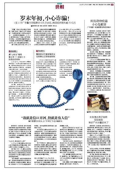 ■新快报记者 彭程 通讯员 张惠明 李长达“民警”来电让你去酒店开房转账,“客服”发送“二维码”让你“扫码退款”,“优质相亲对象”介绍你去投资平台……全部都是诈骗套路!12月15日,新快报记者从广东省公安厅获悉,年关将近,电信网络诈骗犯罪也进入了活跃期,各种犯罪手法花样翻新、层出不穷,令不少群众蒙受经济损失。