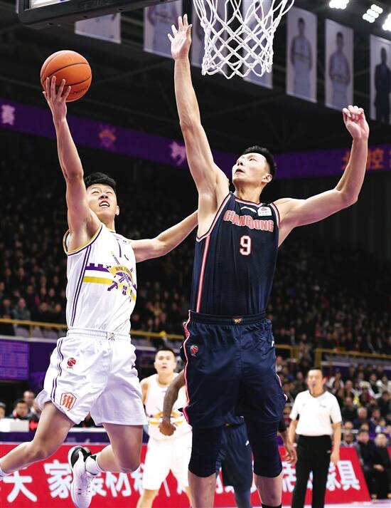 ■广东队球员易建联(右)在比赛中封盖北控队球员许梦君。 新华社发