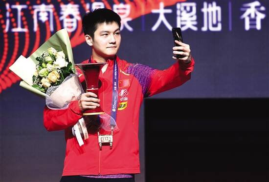 夺冠之后,樊振东在颁奖仪式上玩起了自拍。