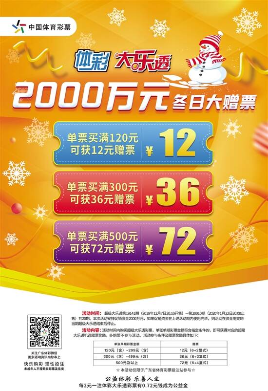 须提醒彩民的是,当大乐透奖池低于15亿元,支持顶格派奖的“浮动奖特别奖”便将退市,目前所余下的机会已不多,令购彩者热情升温。目前广东购彩者购大乐透更有双重利好,广东体彩自第19141期开展大乐透2000万元赠票活动,只需购买单张单期彩票票面金额符合指定条件的,即可获得对应的大乐透机选赠票奖励,具体为:购票金额120元(含)-299元(含)赠12元“6+2”复式;购票金额300元(含)-499元(含)赠 36元“6+3”复式;购票金额500元及以上赠72元“6+4”复式,不设投注方式、中奖条件等限制。
