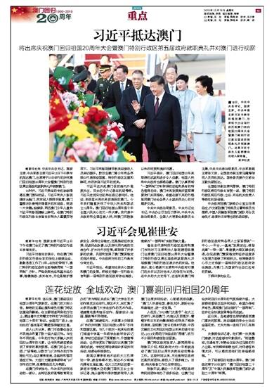 崔世安代表特别行政区政府和澳门市民对习主席和夫人彭丽媛莅临澳门出席澳门回归祖国20周年大会暨澳门特别行政区第五届政府就职典礼并视察澳门特别行政区表示热烈欢迎。他表示,衷心感谢习主席和中央政府对澳门的关怀以及对他本人的信任与支持。在中央的大力支持下,这些年来澳门特别行政区政府和各界人士紧紧围绕“一中心、一平台、一基地”发展定位,借助共建“一带一路”、粤港澳大湾区建设机遇,在促进澳门繁荣稳定和经济适度多元发展方面做了积极努力。他将继续尽心尽力支持新一届特别行政区政府依法施政,为澳门、为国家作出自己应有的贡献。