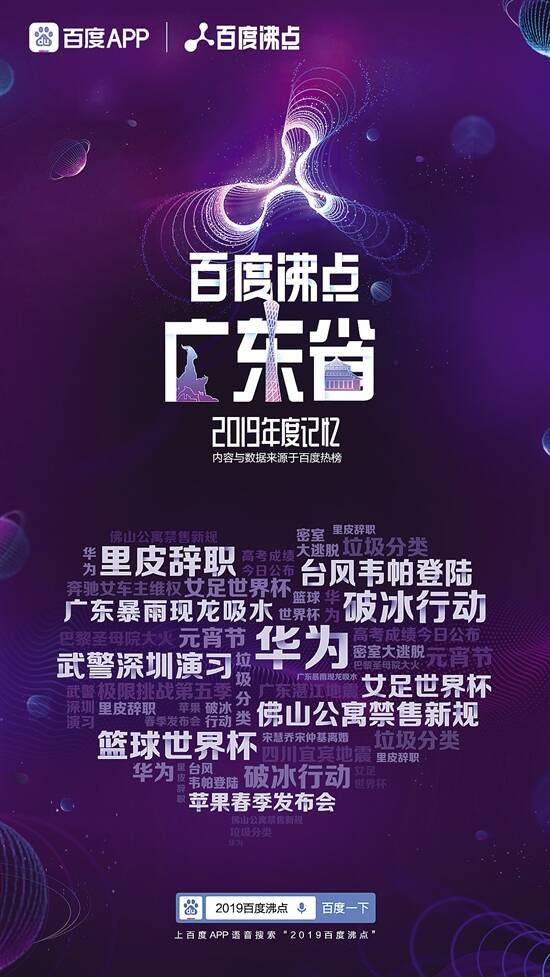 临近年底,大家纷纷做起了年终盘点。12月16日,百度公布了百度沸点2019年度榜单,在聚焦于广东区域的百度沸点广东2019年度记忆榜单中,台风韦帕登陆、广东暴雨现龙吸水等话题上榜,看得出2019年广东人民受到了大自然的格外“关照”;另一方面,广东人对体育事业的热爱也体现在榜单当中,篮球世界杯、女足世界杯等体育赛事也纷纷上榜。■新快报记者 郑志辉