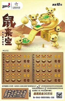 顶呱刮在跨年之际隆重推出经典的生肖套票“鼠来宝”为广大购彩者营造起浓浓的节日气氛。金鼠抱财好兆头,体彩人与全国购彩者一起迎接崭新的2020年,祝全国购彩者财源广进、运运亨通、乐不思“鼠”!刮开覆盖膜,在任意一场游戏中,如果出现两个相同的“鼠”标志,即中得该场游戏右方所示的奖金金额;如果出现“顶呱刮”标志,即中得该场游戏右方所示奖金金额的3倍。中奖奖金兼中兼得。最高奖金30万元。