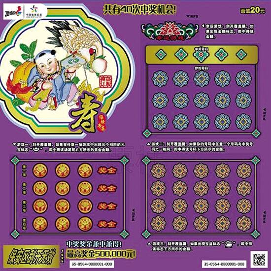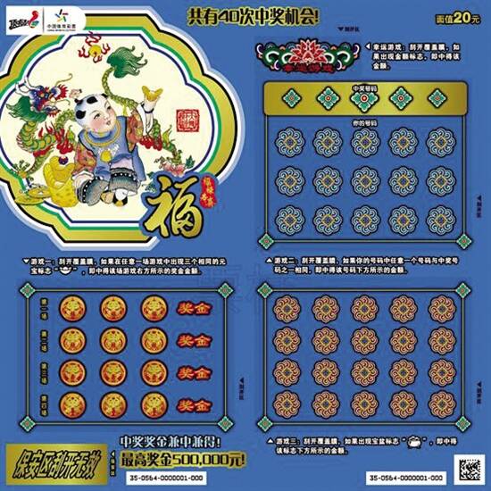 这是一款中国传统文化主题新票,共有四款票面,以国家级非物质文化遗产杨柳青年画为主题,在新年别具一番祝福的意味。最高奖金25万元,玩法更是多样化,游戏一:刮开覆盖膜,如果在任意一场游戏中出现三个相同的“元宝”标志,即中得该场游戏右方所示的奖金金额。游戏二:刮开覆盖膜,如果你的号码中任意一个号码与中奖号码之一相同,即中得该号码下方所示的金额。游戏三:刮开覆盖膜,如果出现“宝盆”标志,即中得该标志下方所示的金额。幸运游戏:刮开覆盖膜,如果出现金额标志,即中得该金额。中奖奖金兼中兼得。