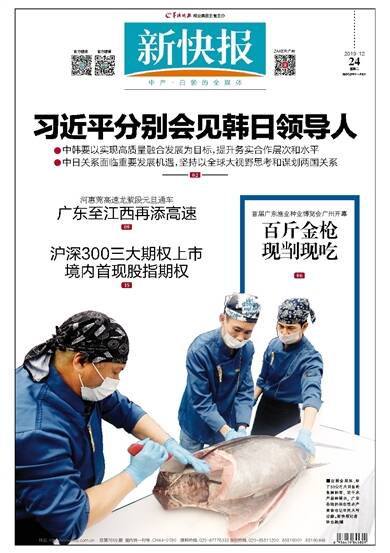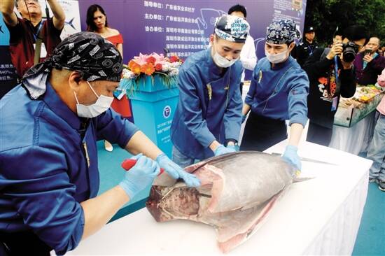 ■在展会现场,除了50公斤大目金枪鱼解剖秀,近千水产品种展示、广东各地的标志性水产美食也让市民大呼过瘾。新快报记者 毕志毅/摄