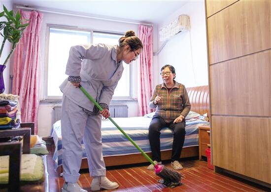 ■某社区居家养护中心的护理人员在帮助社区居民打扫房间。 新华社发