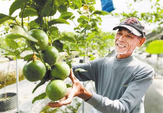 “冯书记说了,我承包这6亩的百香果,只要好好干,收成都归我。”刘品明笑着说,今年67岁的他,以前在深圳打工,后来妻子去世了,只能回来一边种田,一边照顾孩子。2016年,百香果种植基地开始筹建。2017年8月,百香果基地因天灾遭遇“滑铁卢”,而冯书华一到任,遇到的头个难题就是百香果园基地该何去何从。“我们驻村工作队和村委会商量很久,决定对百香果园进行升级改造。”冯书华说,首先对土地进行消毒、灭病虫害处理,并且全部换上升级换代的百香果嫁接苗,其次把百香果的种植模式从平顶式改成窗帘式。最重要是改变基地的运营模式,对于集中种植的65亩,扶贫部门与土地的经营者(村民及贫困户)签订租赁5年合约,并搭建好相应的棚架,无偿提供除草布、限根器和升级换代的百香果嫁接苗,聘请专业公司开展多种形式的免费培训,与茂名全一食品有限公司进行合作,以市场价进行保底收购百香果。对于集中基地种植部分,只要有意愿参与的有劳动能力的贫困户,均可在基地承包在劳动能力范围可种植的数量,所有收成归贫困户所有。对于种植大户及村民(非贫困户),种植收成三成归合作社用于分红,七成归个人所有。
