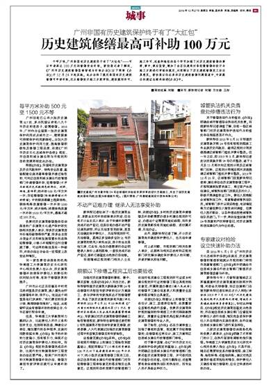 千呼万唤,广州非国有历史建筑终于有了“大红包”——可以申请高达100万元的修缮资金补助。新快报记者了解到,《广州市历史建筑修缮监督管理与补助办法》(以下简称《办法》)于12月24日起实施。此办法除了规定非国有历史建筑修缮可申请补助,还从修缮设计施工方案审批、建设规划许可、施工许可、巡查和验收的各个环节加强了对历史建筑修缮的事前、事中、事后监管,增加了由区住建局对非轻微修缮的设计与施工方案进行审核的规定,对限额以下历史建筑修缮完工后出具意见。新快报以往在多宗历史建筑修缮问题报道中,专家提出的建议也被采纳进《办法》中。■策划统筹:何姗 ■采写:新快报记者 何姗 方汝敏 王彤