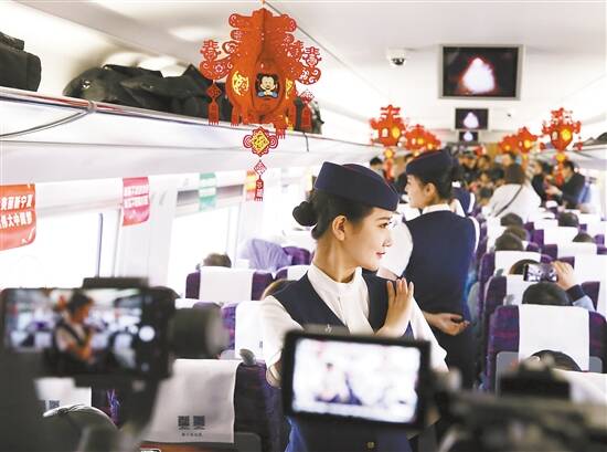 ■12月29日,乘务人员在由银川站开往中卫南站的C8201次列车上为乘客表演节目。新华社发