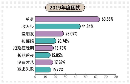 调查显示,单身90后最大的困扰莫过于单身(63.88%)、收入少(44.84%%)和没朋友(28.09%),其次为被催婚(20.74%)、拖延症晚期(18.73%)、长期熬夜(15.05%)、没有才艺(17.56%)、减肥失败(15.72%)。