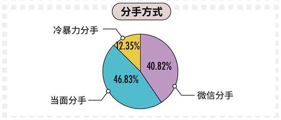 总说分手要体面,但调查显示,竟有四成(40.82%)人会选择微信分手,只有不到五成(46.83%)90后单身男女会选择当面提出。女性比男性更愿意微信提分手。分手方式上,90后惯用“玩失踪”式分手,95后则更“傲娇”,选择冷战等待对方提分手,希望减轻分手负罪感。