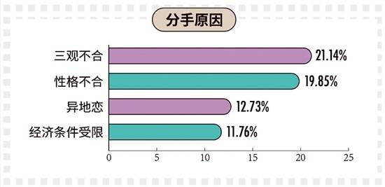 恋爱难免分手,三观不合(21.14%)、性格不合(19.85%)、异地恋(12.73%)及经济条件受限(11.76%)是单身90后分手的四大主要原因。90后分手多是因为三观不合,95后分手多是因为没有共同爱好。