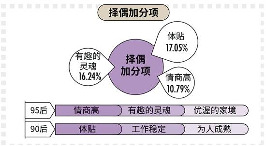 在择偶方面,90后较为注重对方的性格、三观和颜值,其次才是经济收入和家庭环境。此外,就个人特质而言:体贴(17.05%)、有趣的灵魂(16.24%)及情商高(10.79%)都是“加分项”。95后尤其看重高情商、有趣的灵魂及优渥家境,90后则更注重善解人意、工作稳定及为人成熟。