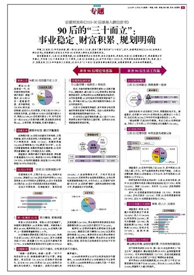 伴随20世纪20年代的来临,第一批90后步入30岁,迎来了属于他们的“三十而立”。近日,珍爱网发布《2019-90后单身人群白皮书》,深度解读已近而立之年的90后单身人群的生活及婚恋状态。报告数据显示,七成90后渴望恋爱;90后最能接受办公室恋情,其次为姐弟恋、异地恋;四成90后微信提分手,两成遭遇分手冷暴力;平均每100个单身里有15个离异;三成90后有副业;90后平均月收入8000元,年终奖首先用来孝顺父母;单身、收入少、没朋友是2019年年度的三大困扰;90后认为“三十而立”应该具备事业稳定发展、金钱财富积累、对未来有明确规划。