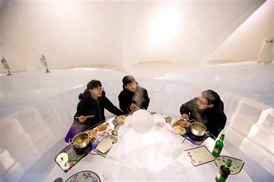 1月5日,第36届中国·哈尔滨国际冰雪节在黑龙江哈尔滨冰雪大世界园区拉开帷幕。游客在冰雪大世界园区品尝起冰火锅来! 新华社