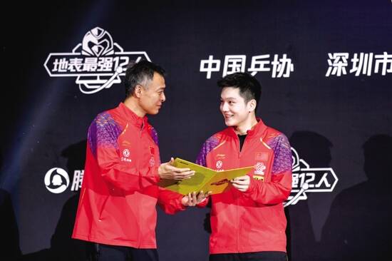 ■教练秦志戬为男单冠军樊振东颁发“通关文牒”。 新华社发