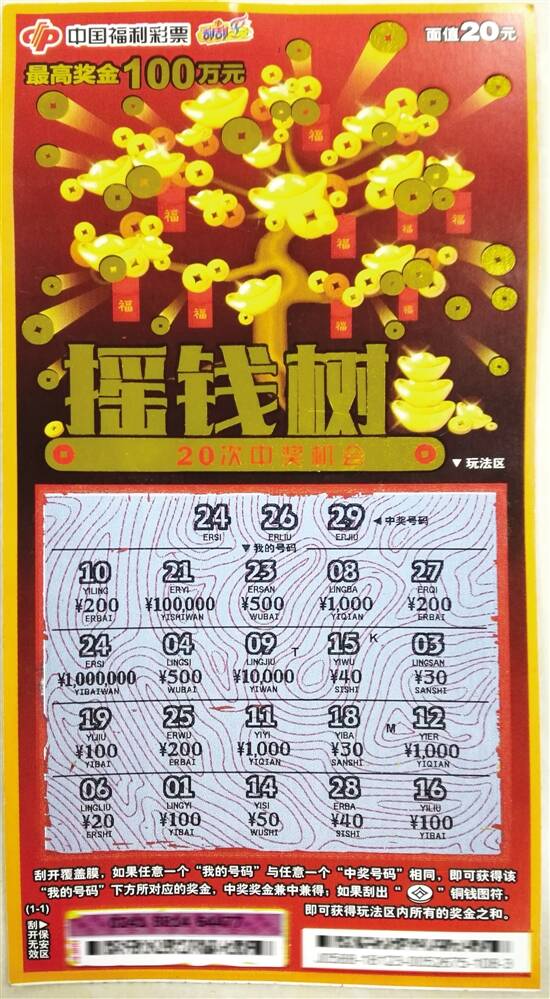 中奖那天,陈先生又来到经常光顾的该站点,跟销售员拿了7张“摇钱树”。陈先生说自己刮彩票有一个习惯,喜欢在投注站里即买即刮,先把“中奖号码”刮出来,再慢慢刮“我的号码”。“没想到这次刮开第一张彩票时惊喜就降临了,第一行都没中,到第二行,出现了‘24’,与中奖号码相符,一看奖金居然是100万元。”
