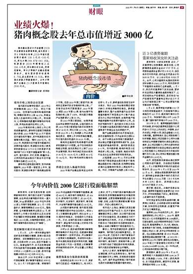 猪肉概念股近日开始披露2019年业绩报告或销售简报。温氏股份1月6日晚间公告称,2019年温氏股份预计盈利138.5亿元-143亿元,同比大增249.97%-261.35%;牧原股份2019年销售收入达196.6亿元,同比增长近五成。受消息影响,昨日万得猪产业概念股强势拉升,温氏股份股价收盘涨6.75%,益生股份涨10.01%。新快报记者据万得数据统计,去年万得猪产业概念23只股票总市值增长2891亿元。■新快报记者 郑栩彤