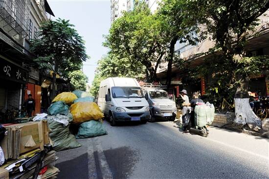 ■1月8日,光复北路的两侧通道被大量的编织袋和车辆占用,仅留下一条狭窄的通道。